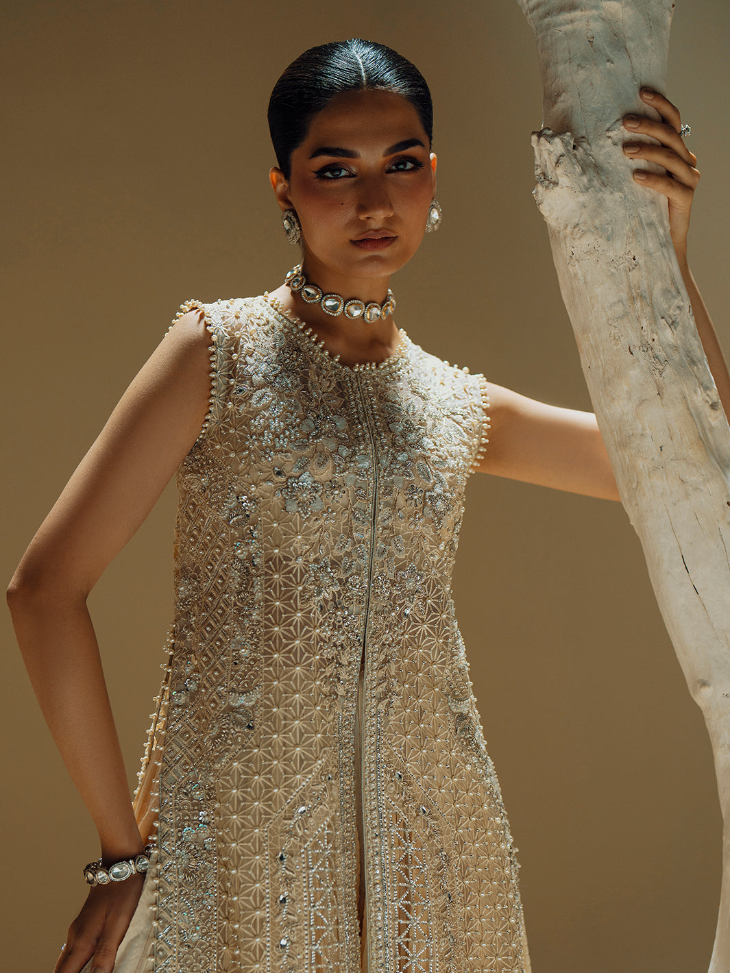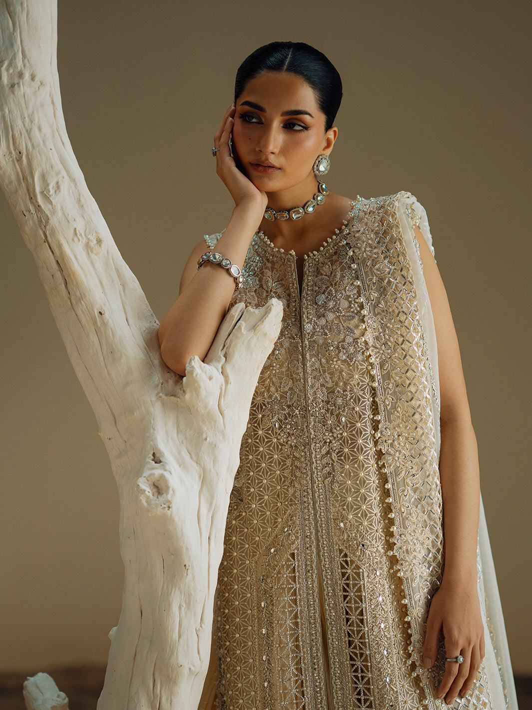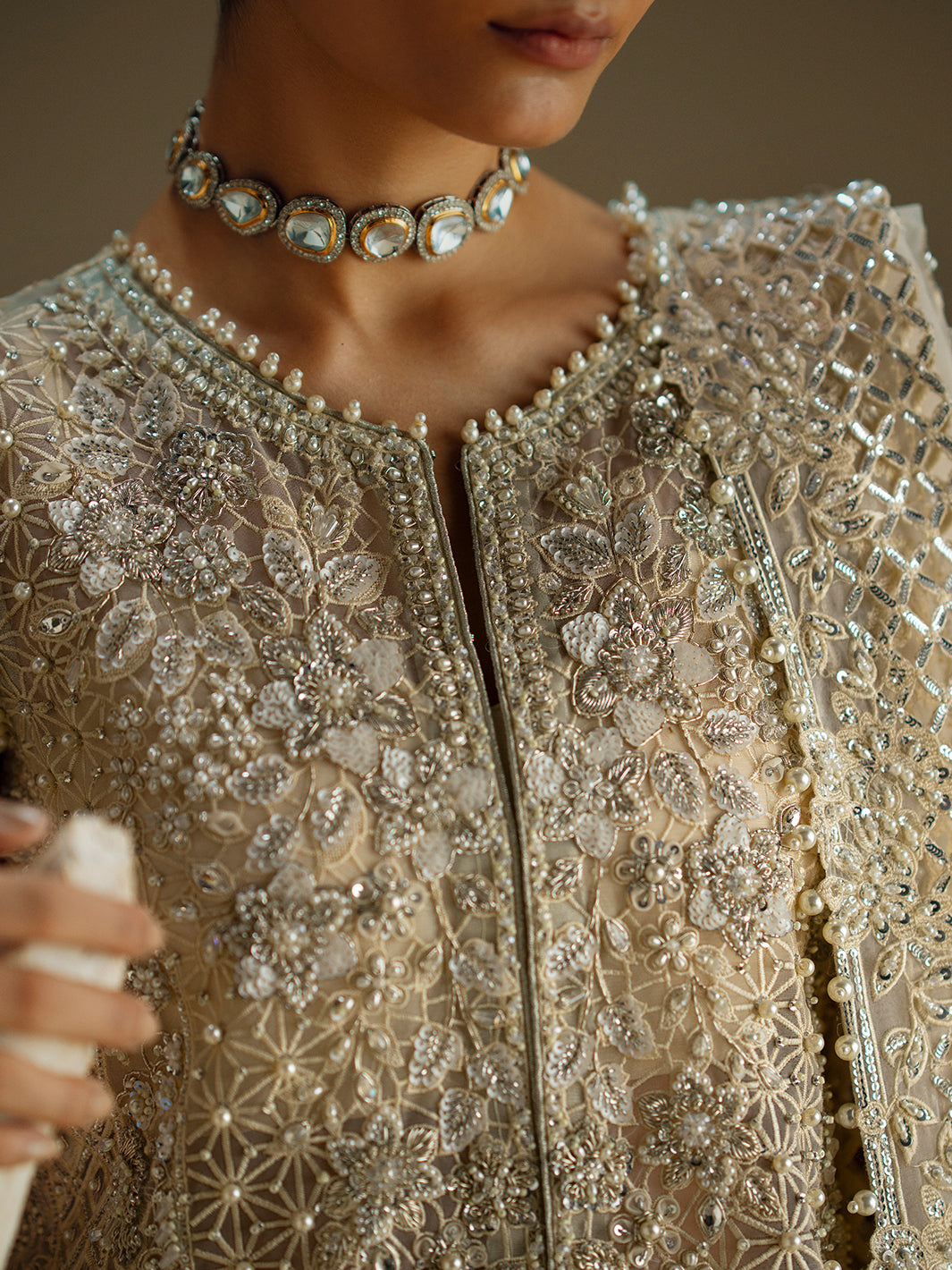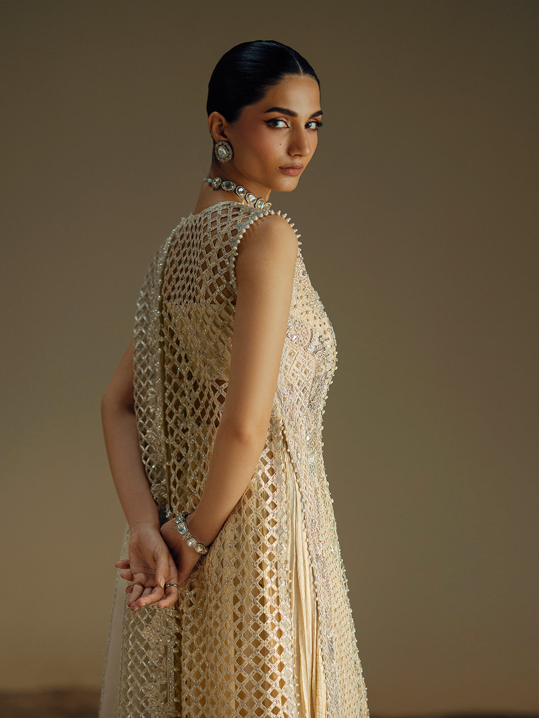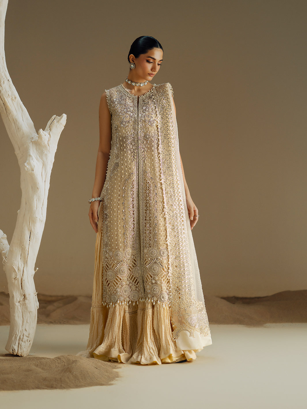 Crafted for the modern woman who cherishes tradition, this exquisite ivory ensemble is a vision of timeless elegance. The long, flowing jacket is a masterpiece of artistry, meticulously adorned with intricate handwork including shimmering pearls, radiant Swarovski crystals, and delicate cutdana, dabka, and naqshi embroidery. This rich tapestry of embellishments catches the light with every movement, creating a truly dramatic effect. Paired with a delicate organza dupatta and chic crushed trousers, the silhouette balances traditional opulence with contemporary flair, making it an unforgettable choice for grand festive occasions and celebrations.