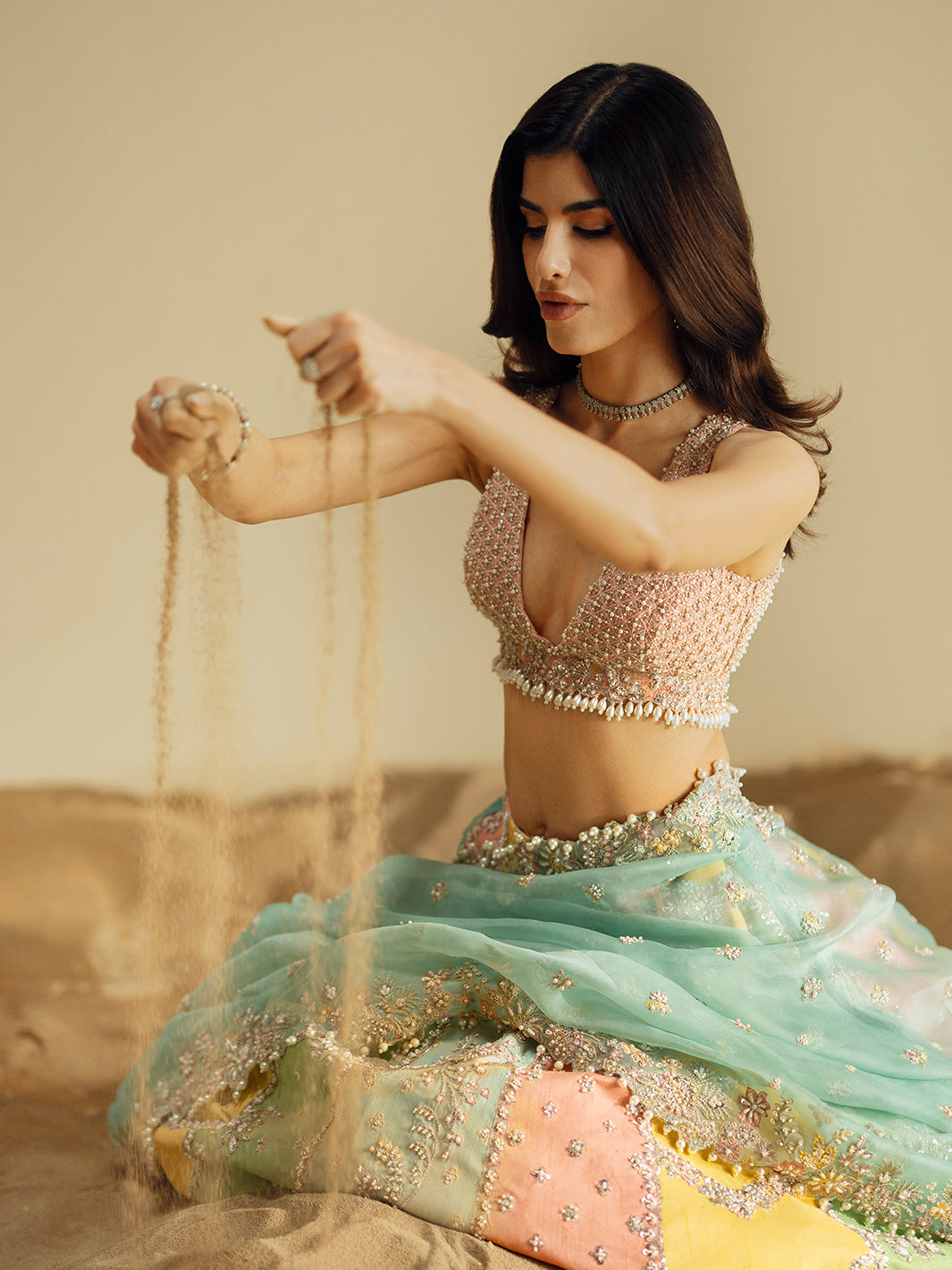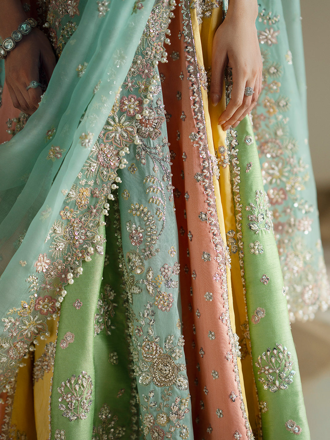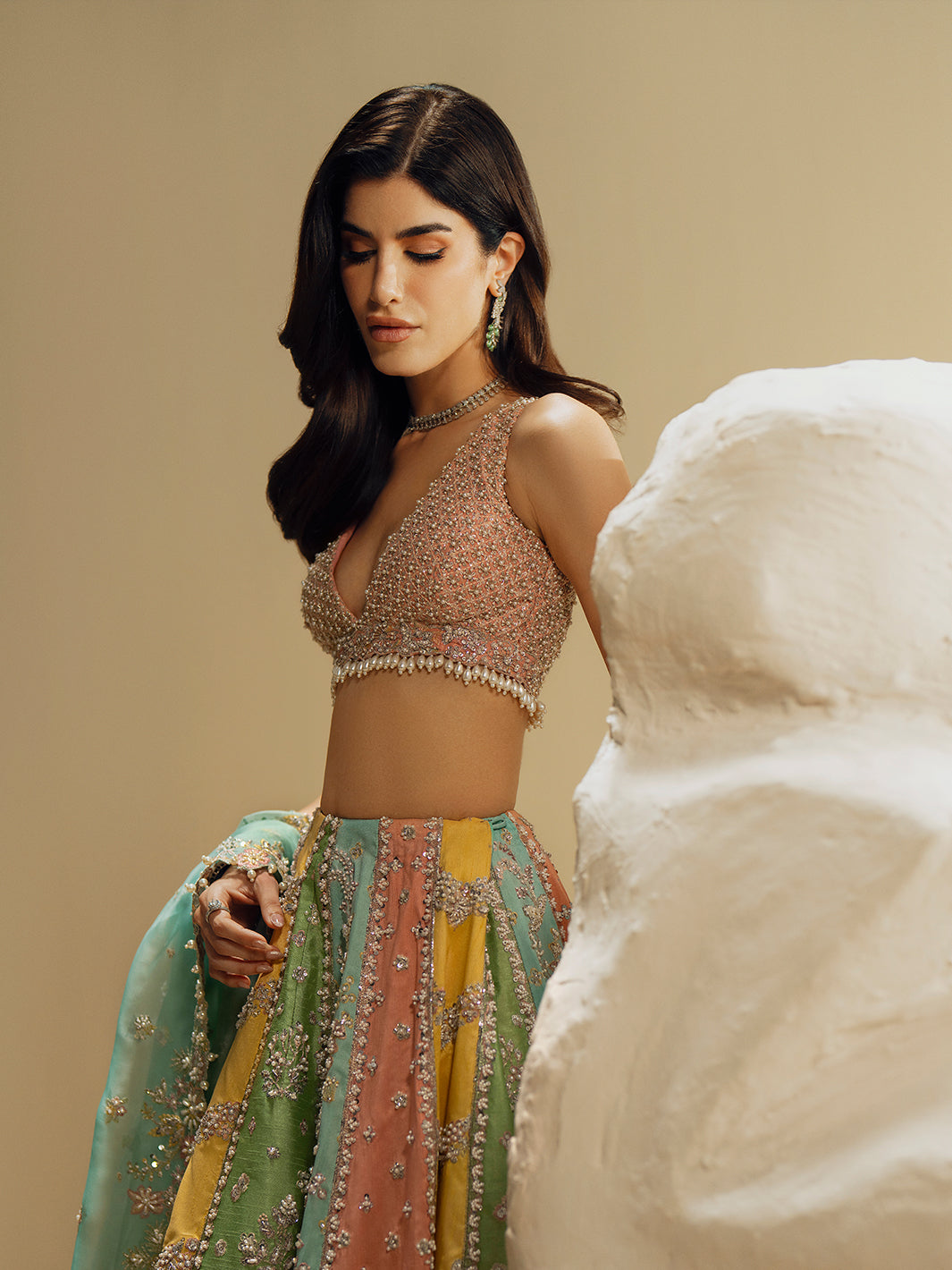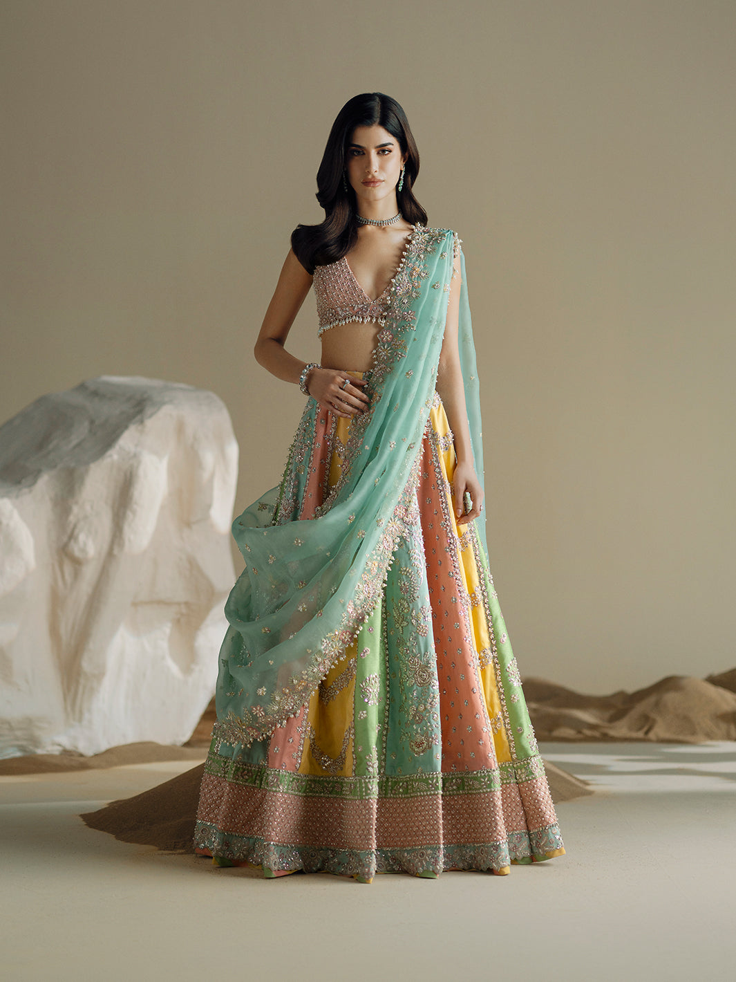 This stunning lehenga choli is a breathtaking display of traditional artistry and modern elegance. The lehenga, is a masterpiece of design, with vertical panels in soft pastel shades of pink, yellow, green, and blue. Each panel is richly embroidered with a combination of detailed dabka and naqshi work, shimmering sequins, and delicate pearls, creating a captivating texture and sparkle that catches the light. The intricate handwork is further enhanced with dazzling Swarovski crystals, adding a luxurious and ethereal quality.