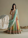 The outfit is completed with a coordinating choli, or blouse, that features similar intricate hand-embroidery and a graceful pure organza dupatta draped elegantly over the shoulder. This ensemble masterfully combines a vibrant, playful color palette with sophisticated, time-honored craftsmanship, making it a perfect example of a contemporary yet traditional formal wear.