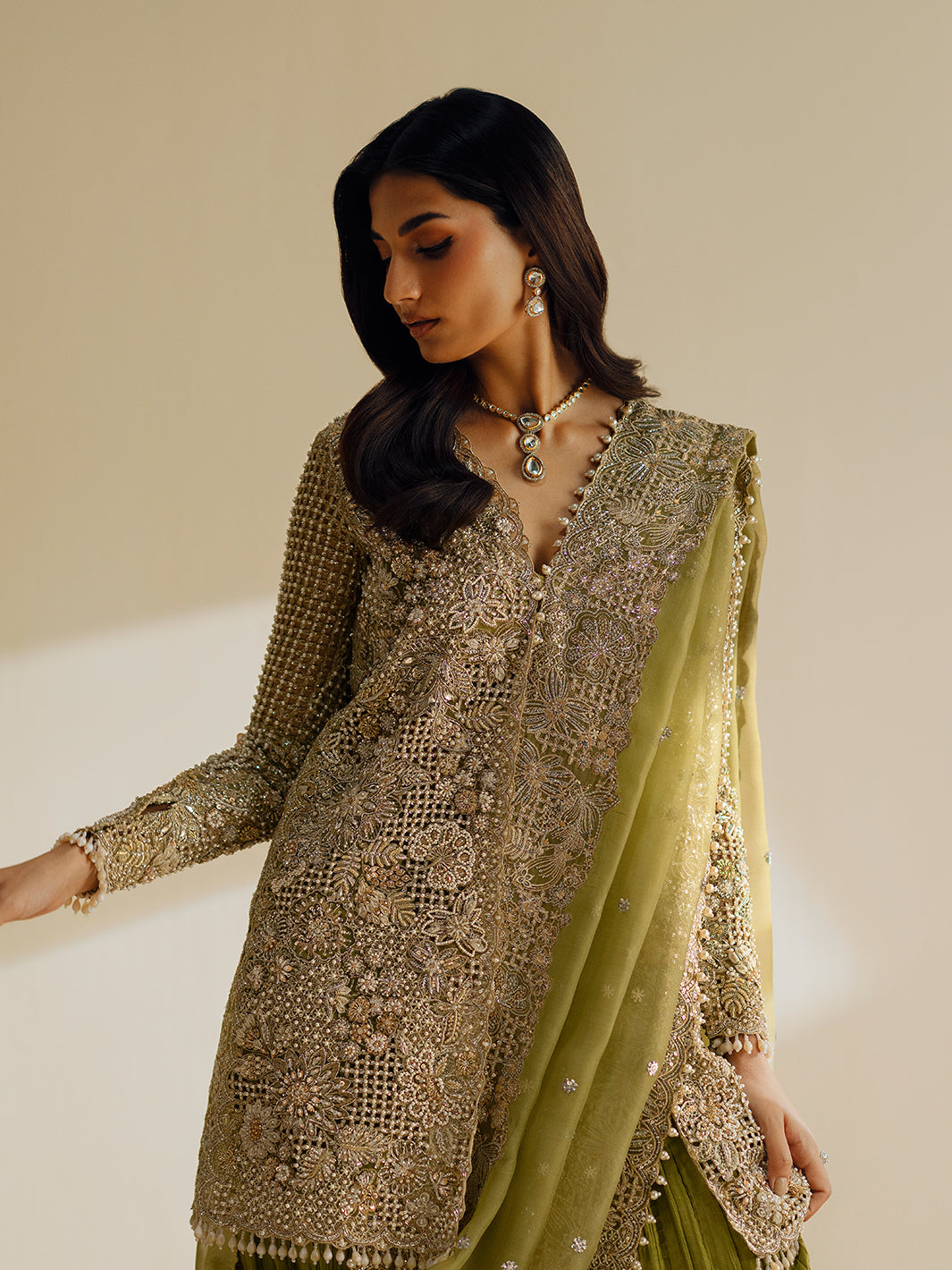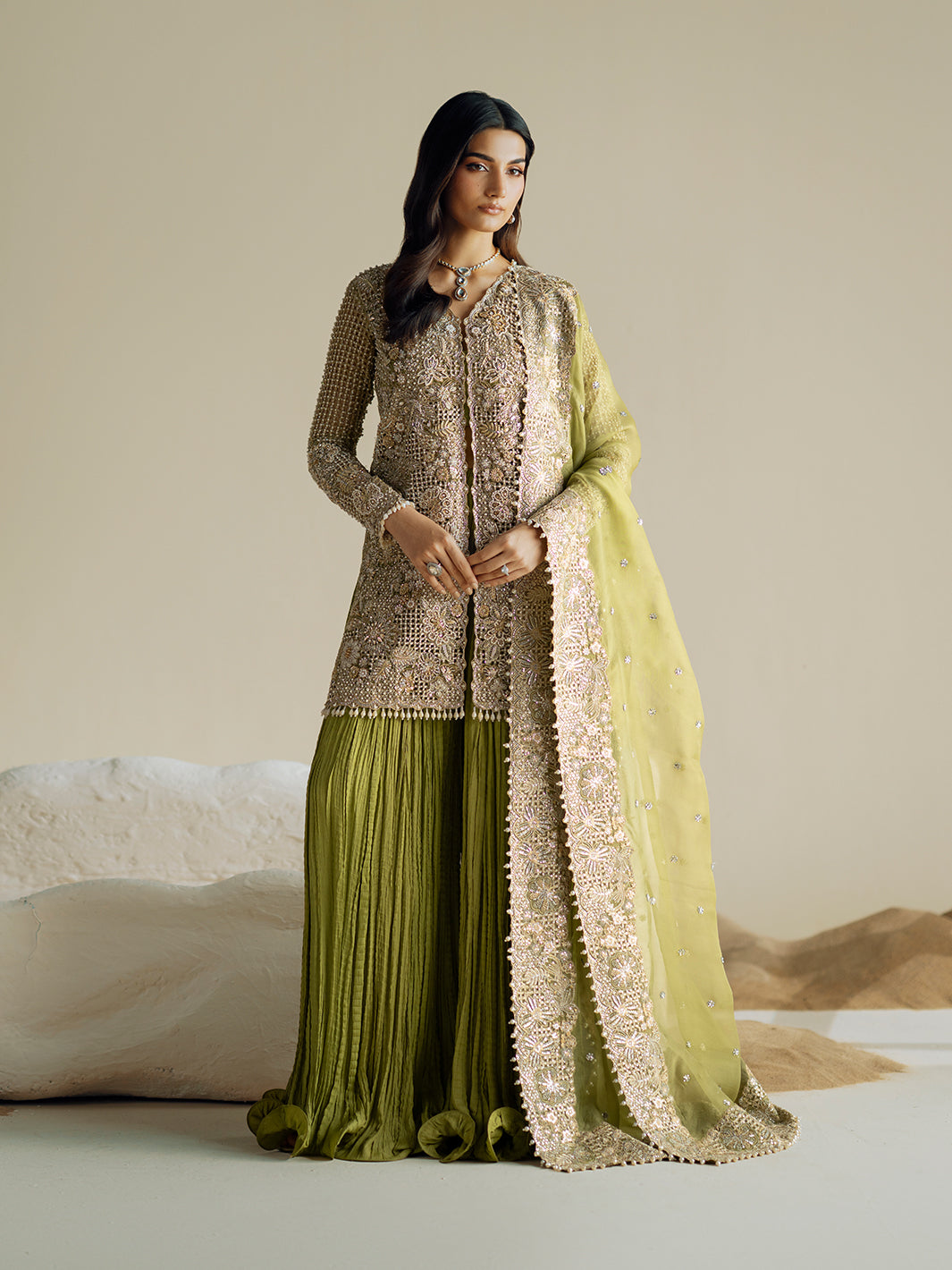 This masterpiece from the Olivia Festive Collection is a celebration of traditional craftsmanship elevated with contemporary glamour. The fitted jacket silhouette is draped in an antique gold hue, featuring an incredibly dense tapestry of hand-embellishment that incorporates every luxury technique, including shimmering cut dana, sparkling Swarovski crystals, and dimensional naqshi and dabka metallic threadwork. This opulent jacket is paired with a stunning, voluminous crushed sharara in a complementary tone, creating striking movement and texture. The look is perfected by an accompanying pure organza dupatta featuring delicate sequin embroidery along with rich pearls and tassels at the edges, culminating in an outfit that is a truely sophisticated, and unforgettable.