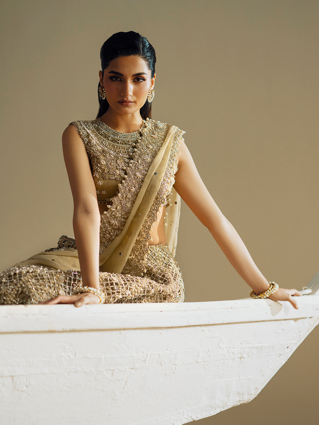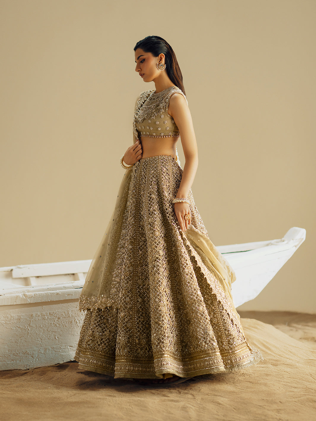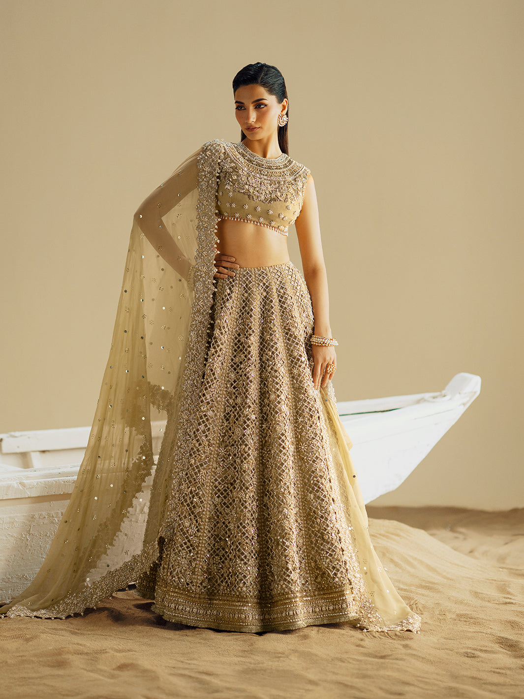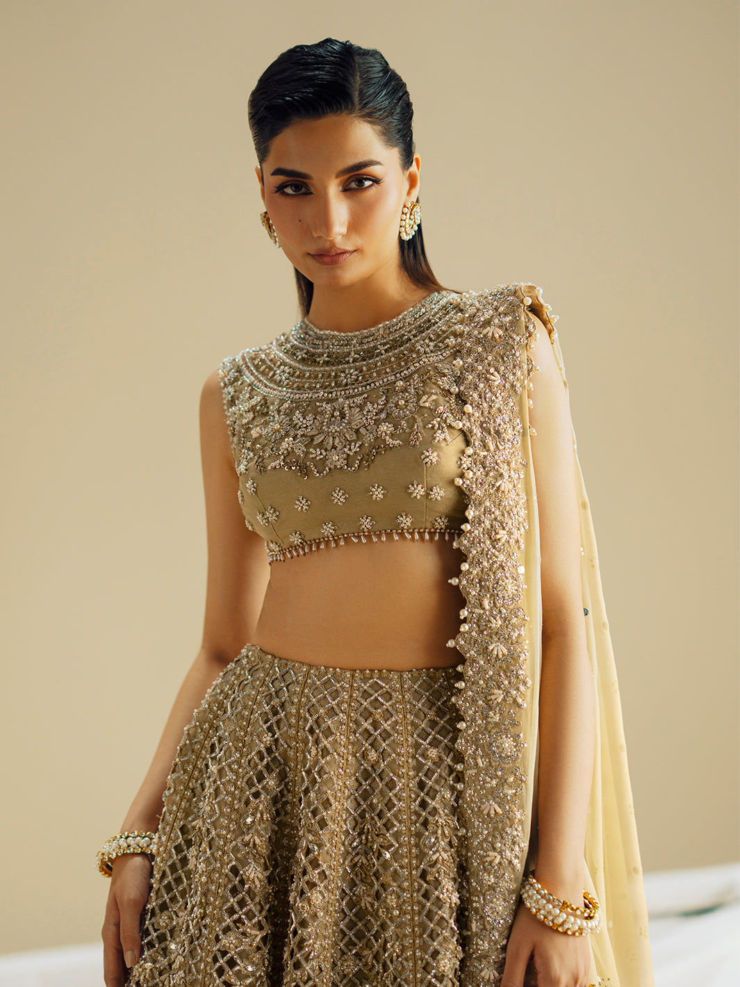 This breathtaking bridal lehenga is a masterpiece of traditional craftsmanship, designed to create a dramatic and unforgettable presence. The ensemble is a radiant tribute to Pakistani and Indian heritage, featuring a lavish display of handwork that meticulously combines pearls, kora, dabka, and naqshi embroidery. The lehenga's skirt is a canvas of intricate detail, with each stitch and bead contributing to a rich, textural tapestry. The addition of delicate cutwork adds another layer of complexity, revealing a peek-a-boo effect that is both elegant and modern. The entire outfit is gracefully complemented by a fine chiffon dupatta, which cascades with a gentle, flowing movement. This piece is more than just clothing; it is a work of art, with each element carefully chosen to create a stunning, cohesive look suitable for the most special of occasions.